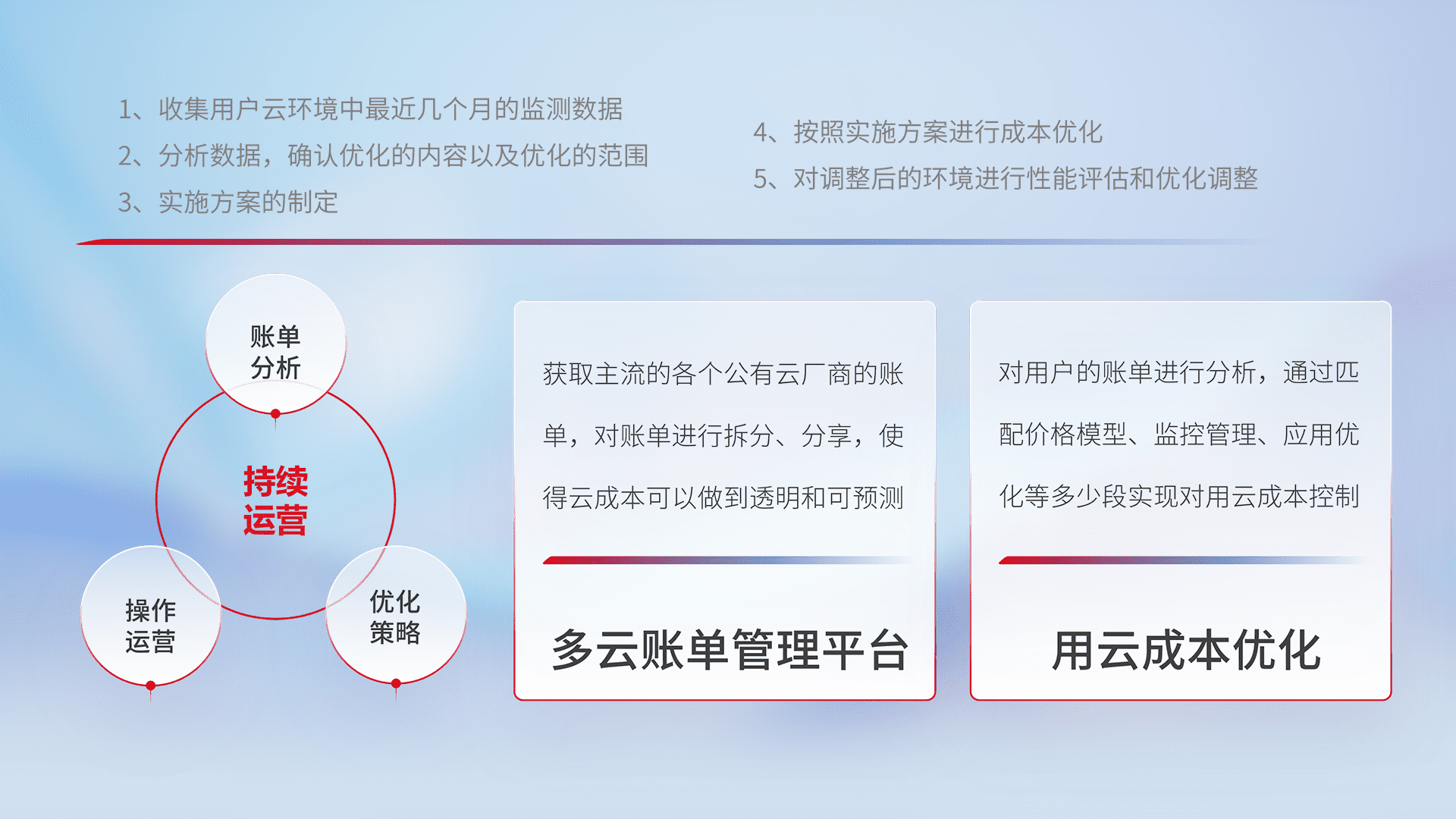 通过多云纳管,,,以统一的资源数据模型把客户的云资源进行抽象和封装,,,,进而实现对多云资源的统一操作,,,,保障云资源管理的可靠性、、稳定性与可用性。。。。量身定制化运维内容,,,,配置、、、、开发运维、、补丁管理、、备份、、、监控、、、、认证和访问管理、、、、审计和日常巡检等,,,,保障在用云过程中的可靠度,,,稳定度以及高可用率。。。。